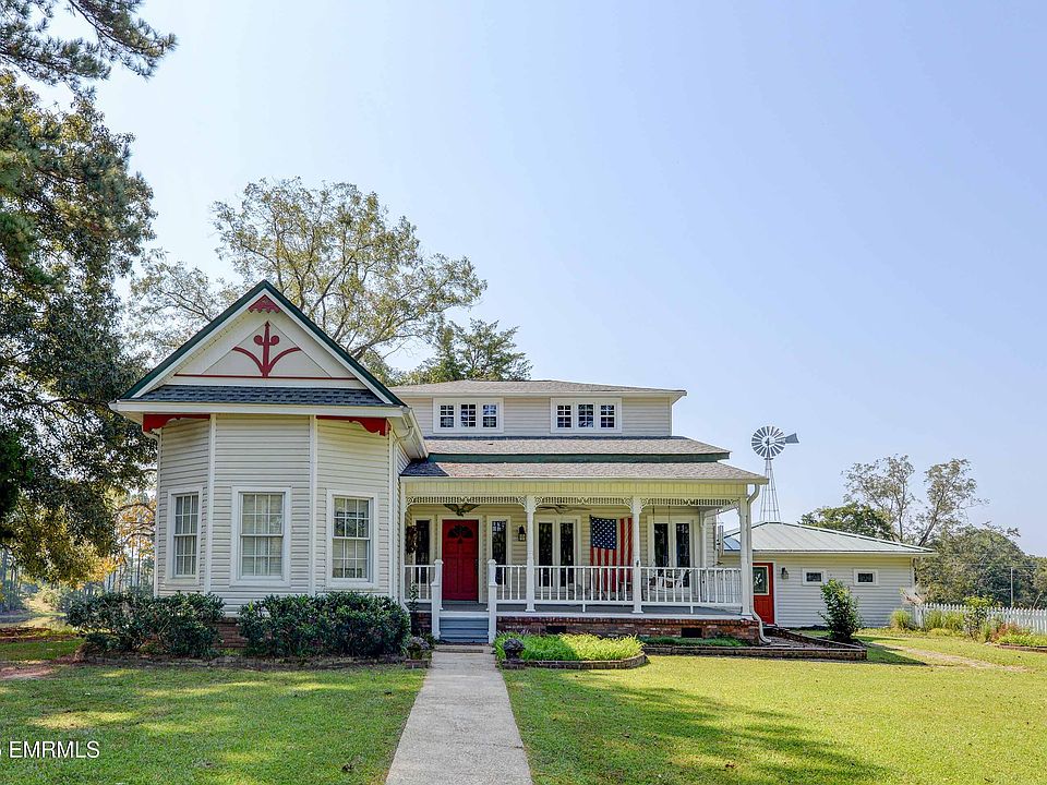 This beautifully preserved and thoughtfully updated historic farmstead offers the perfect blend of Southern charm, modern amenities, and endless recreational possibilities, perfect for a homestead, equestrian retreat or private country escape. Set on approximately 95.5 acres of gently rolling terrain, the main farmhouse features 5 bedrooms and 4 full bathrooms, including a luxurious main-level primary suite. Two inviting living areas boast exquisite wood ceilings—one with a cozy gas fireplace and the other with classic brick flooring. The spacious kitchen includes abundant cabinetry, generous prep space, and a walk-in pantry, while the elegant dining room is framed by leaded glass windows. Additional highlights include a home office, oversized laundry room, an auxiliary laundry facility, two-car garage, spacious covered front porch, and a covered back porch with Trex decking overlooking serene pastureland and pond. A separate 1-bedroom, 1-bathroom guest cabin includes a private dock and fire pit overlooking an additional pond. The property is loaded with amenities: a saltwater pool and cabana; a 7-stall horse barn with loft, two tack rooms and washroom/8th stall; a massive equipment barn; fenced and cross-fenced pastures with automatic watering troughs; greenhouse; mature fruit trees, shrubs, and vines; and majestic shade trees along with a pecan orchard and black walnut trees. Three ponds, a windmill-powered well, two additional wells, and community water connections provide robust water access. Recent updates include architectural shingle roofing (2022), polyurea roofing (2024), and freshly painted red oak fencing. There's abundant road frontage, and the acreage spans both sides of the road for exceptional privacy and versatility. This extraordinary property offers an unparalleled lifestyle. Whether you're looking to farm, entertain, raise animals, or simply connect with nature, this estate delivers timeless beauty and peace and tranquility for the soul. This is truly a once-in-a-lifetime legacy property- don't miss this rare opportunity to make this homestead yours! And please enjoy the video tour!