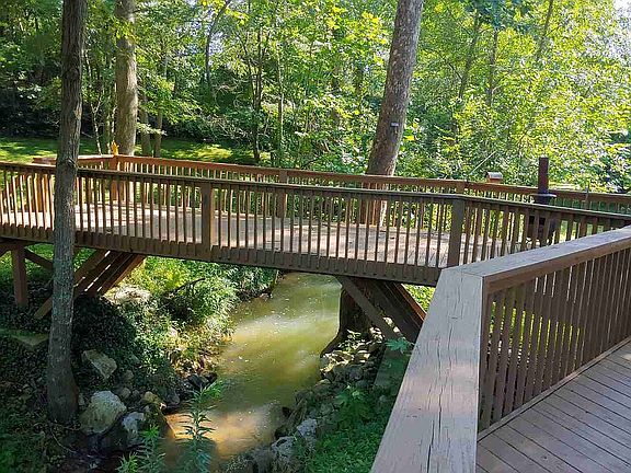 Cape cod 2 story with additional fully finished 1 bedroom apartment. Deck all around house that bridges flowing creek. High open wood ceiling above living room. Master bedroom and bath down and loft and 2 bedrooms up with Jack and Jill bathroom. 3.61 acres with lot of trees and spring fed creek running through creating park like setting. Pavilion with fire pit and equipment building in back yard.