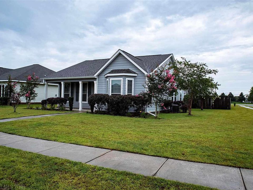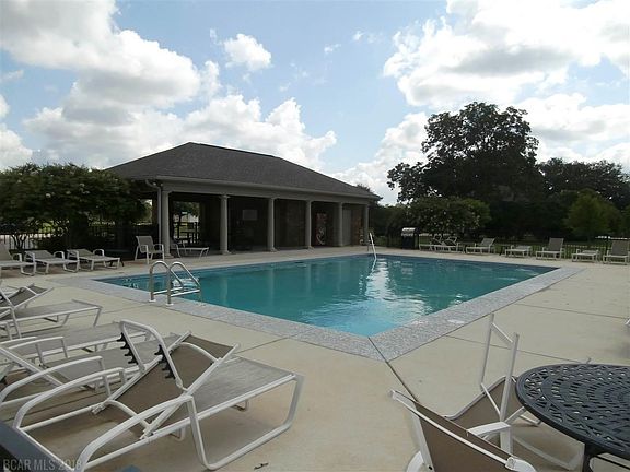 Easy access to I-10 and Mobile, Fairhope schools, community pool, corner lot, beautiful open plan, 3/2 home in highly sought after Oldfield. Detached double rear entry garage, covered walkway, covered front porch and a screen porch in back, large fenced yard, gutters, bay window, dark rich cabinets with light granite makes a beautiful contrast, with stainless/steel appliances, granite counters in bathrooms, crown molding through out, wood flooring in living room, tile in kitchen and wet areas, carpet in bedrooms, trey ceilings in master and LR. Large master bedroom, master bath has garden tub, and separate shower. Make an appointment to see this move in ready home!