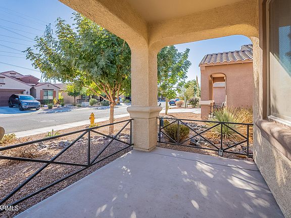 This move-in ready home features 5 bedrooms and 3 full baths to accommodate a large family! One of the bedrooms is separated at the front of the home with its own private, full bathroom next to it. This home features a spacious family gathering room open to the kitchen. The eat-in kitchen features Espresso cabinetry with complimentary granite counter tops, stainless steel appliances to include a new refrigerator, and kitchen island with seating for two. The Master Bedroom features a large walk-in closet with lots of shelving for storage and the Master Bath features double sinks, a garden tub, separate shower, and private toilet room. There is a large laundry room off the kitchen that includes a washer, dryer, and a separate area with lots of shelving for storage. There are also two other large storage closets with shelving, one in the hallway close to the kitchen and the other between the kitchen and family room. Other features include Espresso cabinetry throughout, 2-panel interior doors, 2" wood look blinds, neutral interior paint, 3" baseboards, 9+ foot ceilings, recessed lighting in the kitchen and master bath, and 16" tile throughout except for newer, laminate wood look flooring in all bedrooms. Great curb appeal and cozy front porch to sit on and enjoy the views of Estrella Mountain to the south. Close to shopping, dining, and the I-10 freeway!
