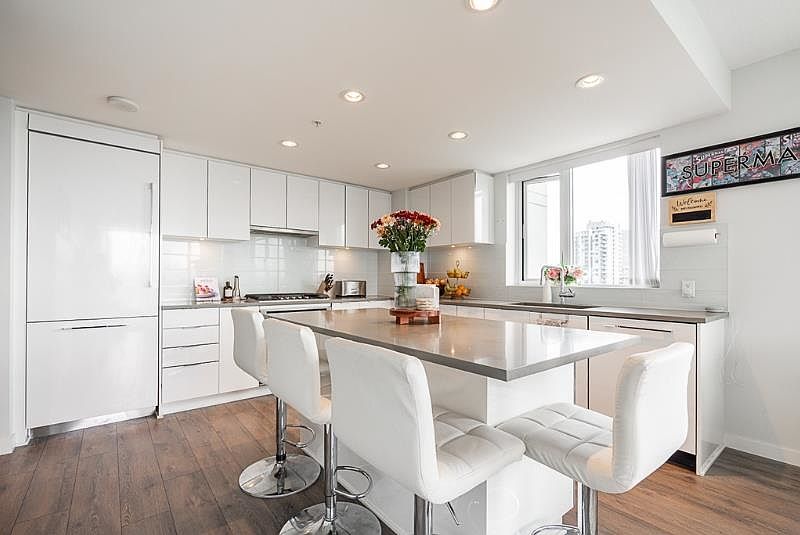 Functional open layoutContemporary kitchenQuartz countersGas cooktopBuilt-in fridgeFloor-to-ceiling windowsCustom closets