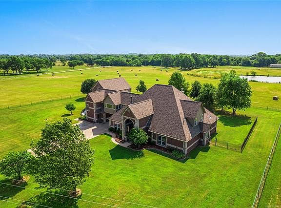 GORGEOUS Must see home on 40 acres! Enjoy the spacious living with beautiful hardwoods, high ceilings, formal dining, multiple fireplaces, 4 bedrooms, office, guest quarters, open concept and beautiful outdoor entertaining area. Country view with modern touches. Cozy home with a fireplace in the master Suite. Large safe room as well as an amazing theater room. Pipe fencing, improved grass, pond and paved roads!