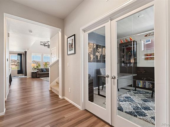 Welcome to this stunning two-story home in the highly desirable Rocking Horse neighborhood. The floor plan is fantastic, and the location couldn’t be more convenient. On the main floor, you’ll find a beautiful home office enclosed with elegant glass French doors—perfect for working from home. The open-concept kitchen is a dream for anyone who loves to cook or entertain, featuring white cabinetry, stainless steel smart appliances (including a gas range, smart oven, and newer refrigerator), and tons of counter and storage space. It flows seamlessly into the living room, where soaring ceilings and double-height windows frame peaceful views of the open space and trails right outside your back door. There’s also a large walk-in pantry and a built-in desk nook (bonus room) just off the mudroom, a great spot for a quick workspace or homework area. Upstairs, a spacious loft makes a perfect second office, play area, or media space. The private primary suite offers a luxurious retreat with a five-piece bath—complete with quartz countertops, a soaking tub, tiled shower with a bench, and two large walk-in closets. The two additional bedrooms share a large Jack-and-Jill bath and each feature walk-in closets and smart ceiling fans. Outside, relax and unwind on the covered Trex deck while enjoying peaceful views with no neighbors behind you. Enjoy those Colorado nights by the fire pit. The unfinished walk-out basement is full of potential and ready for you to make it your own. With a 3-car garage and a walk-out basement, this home is filled with endless options and thoughtful upgrades throughout. This home has been incredibly well cared for and truly shines—schedule your private showing today!