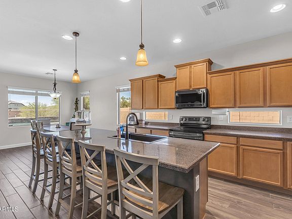 This stunning home in Watson Estates offers an oversized lot in the thriving community of Buckeye. From the moment you arrive, the striking stone accents and RV gate set the tone for this beautifully upgraded residence. The interior boasts large plank tile flooring throughout the main level, leading to a spacious great room designed for open-concept living. The gourmet kitchen features an expansive island with stone countertops, upgraded cabinetry, and stainless steel appliances—including a smart refrigerator. Adjacent, a generous dining area transitions seamlessly to the outdoors, where a large covered patio, paver walkway, firepit, built-in BBQ, and sparkling pool create an entertainer's paradise. Upstairs, wood-like flooring extends through a versatile bonus space and guest bedrooms, accompanied by a well-appointed bathroom. The primary and guest bedrooms, conveniently located on the main level, provide privacy and easy accessibility. The primary ensuite showcases refined updates, including a dual vanity with stone counters and raised bowl sinks, custom lighting, and framed mirrors. The luxurious retreat continues with an oversized soaker tub and a spacious walk-in shower adorned with custom tile and a sleek glass enclosure.