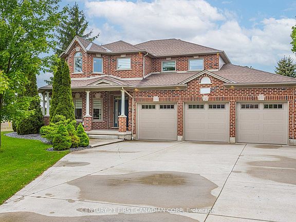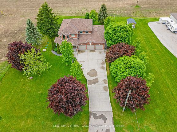 Peaceful Country Living Just Minutes from the City! **Extensively Upgraded Throughout, 4 Car Garage & Estate Sized Lot** Welcome to this serene, solid red brick 2-storey home set on a picturesque 0.60-acre lot backing onto open farmers fields in sought-after Denfield. Ideally located just 5 mins to Ilderton, 10 mins to North London & Lucan, this nearly 4,000 sq ft home combines the tranquility of country living with city convenience. The main floor was fully renovated in 2024 by Details Custom Homes, showcasing white oak hardwood floors, custom cabinetry, and floor-to-ceiling concrete-style fireplace surround. The chefs kitchen features a massive quartz island with built-in storage, brand-new stainless appliances, a custom coffee bar, and custom pantry cabinetry with pull outs. A spacious mudroom with cubbies and a fully redesigned laundry room connect to the oversized 4-car garage, complete with a walk-up and tandem door to the backyard-ideal for families and hobbyists alike. A large study with bay windows & upgraded 2pc bathroom complete the main floor. Upstairs you'll find 4 spacious bedrooms, a stylish 5-piece main bath, and a luxurious primary suite with walk-in closet and spa-inspired ensuite. The fully finished basement adds even more living space with a large rec room, cozy fireplace, full bathroom, and flexible space perfect for entertaining or play with walk-up to garage. Step outside to enjoy breathtaking sunsets from your concrete patio, overlooking quiet fields and a wooded area with a tranquil pond.Extensive recent upgrades include: all new windows (high-grade, triple pane)/doors, furnace, A/C, owned HWT, all appliances, upgraded insulation, window coverings throughout and, new garage doors & newer roof. Truly move-in ready with every detail considered. A short walk to Denfield Park complete with baseball fields, tennis courts & playground, surrounded by gorgeous executive properties. This home must be seen to be truly appreciated!