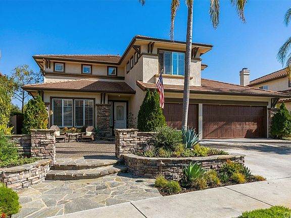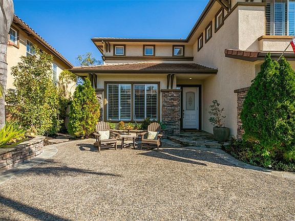 Majestic canyon views, traditional architecture, & a bold touch of contemporary Southern California flair blend together to create one of the most desirable, executive homes in the the coveted enclave of guard gated Stone Ridge. This cul de sac home is equally ideal for day-to-day living & unforgettable entertaining with a spacious two-level floor plan extending on a generously sized 10,897 sq ft lot. Discover 6 bedrooms (one currently used as an office) 4 full and 1/2 baths, large open living spaces, a gourmet chef's kitchen w/ an abundance of preparation spaces & cabinetry plus walk-in pantry. The outdoor living is as equally impressive w/ heated loggia, built-in BBQ w/ fire feature & kegerator, putting green, a resort style, pebble tec, salt water pool w/ water feature, slide & diving board, large fire pit & new plexiglass fencing allowing seamless views of the canyon & Saddleback Mountain. The interior boasts high ceilings & an abundance of natural light. Relax & renew in the spacious ensuite master that includes a bathroom w/dual vanities, soaking tub, walk-in shower & his/her closets. Soak in the sunrise w/ a cup of coffee, or relax at the end of the day, on the expansive master balcony. The perks include 2 fireplaces, 2 A/C units, solar energy, hardwood flooring, finished 3 car garage wi/ custom built-ins, indoor/outdoor surround sound, & gorgeous landscape. Close to shops/restaurants , Lake MV, SoCal beaches, hiking/biking trails, freeway & toll roads