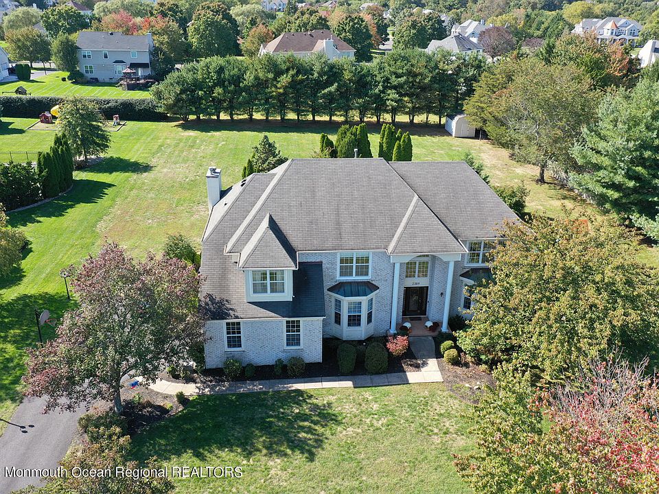 Welcome home to Orchard Ridge! This stately brick-front colonial sits on 3/4 of an acre, boasts 5 bedrooms, 3 full baths, 2 car garage, plus a full basement! Enter into the light and bright two-story foyer with grand staircase, palladian window & two coat closets. The first floor features a sunken living room with bow window, guest bedroom, formal dining room, large kitchen & two-story great room featuring hardwood floors, palladian windows, gas fireplace & a wet bar. The eat-in-kitchen boasts a center island, stainless steel appliances & granite countertops. Sliding glass doors off the kitchen lead to your private oasis: entertain on the large deck covered by a new custom awning, relax in the large fenced in-ground pool with newer filter and cover, or play in the huge yard. The primary suite features tray ceiling, recessed lighting, walk-in closet, and en-suite bathroom which offers a soaking tub, stall shower, and separate vanities with plenty of storage. Three additional large bedrooms with ample closet space and a full bath, featuring a tub and double vanity, round out the second floor with a clerestory to the great room.