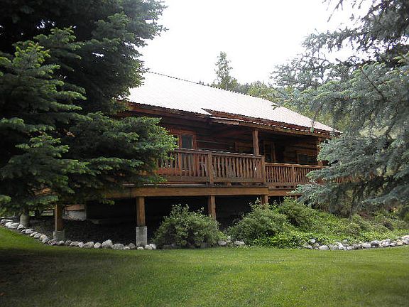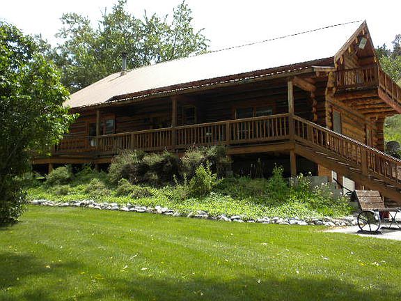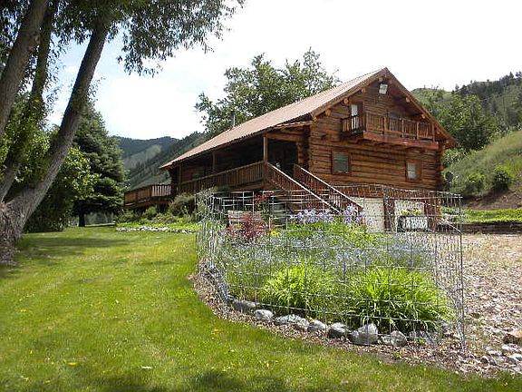 BEAUTIFUL HAND HEWN LOG HOME and acreage in a very Pristine setting. Large covered deck overlooks the Beautiful Mountains and Valley!! There are two Trout Ponds & the property backs up to Forest Service property plus borders 4th of July Creek!! Irrigation is all gravity flow with good water rights. Property is fenced and has two machine sheds plus a wood shed. The home offers Hickory kitchen cabinets & Corian counter tops, hardwood floors plus built in refrigerator. Main floor offers kitchen, living room w/wood burning stove 2 bedrooms, bath, pantry, plus separate laundry/mud room. Upstairs offers a master suite with loft sitting area plus office area. Lower level has oversized garage, a large pantry/storage area plus a walk-in-cooler. An abundance of storage and closet space. Propane furnace is located in the garage. Home is wired into emergency generator system. Park like grounds and mature trees. Picnic area with native rock BBQ adjacent to house. Come take a look. You will not be disappointed.