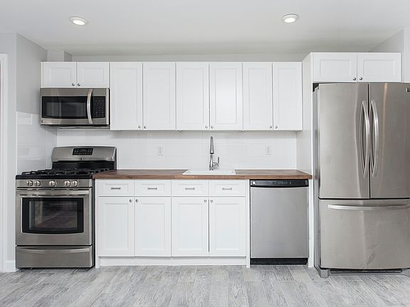 Landlord pays fee! Come home to this renovated two bedroom, two bathroom apartment in a wide historic brownstone building on beautiful 4th Street in Downtown Jersey City. The modern kitchen has white cabinetry with walnut Herringbone counters, subway tile backsplash and stainless steel appliances. Enjoy having large windows in the living/dining room area with recessed lighting, generous closet space and a washer/dryer in the apartment. This sought-after location is only eight minutes to the GROVE STREET PATH. The commuter bus stop to NYC Port Authority is located 5 minutes away at Hamilton Park (Jersey Avenue and 9th). The home is minutes from restaurants, parks, and Farmers Markets.