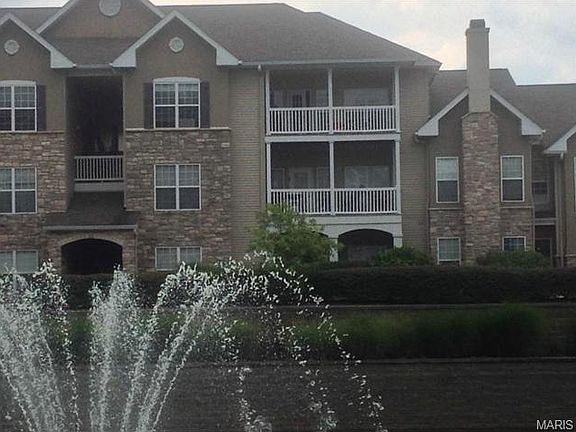 SPECTACULAR Lake View w/Lighted Fountain from the private balcony...Enjoy surrounding water sounds from lake & babbling brooks. Not a short sale or foreclosure ~ just a good value. Gently lived in w/no pets or smokers. Turnkey unit includes refrig. & full-size washer & dryer in Laundry Rm off the kitchen. Features 42" cabinetry w/granite counters & breakfast bar. Dining Rm w/chair rail & nickel chandelier. 9 ft Ceilings & six panel doors. Living Rm has tray ceiling w/crown molding, a corner gas fireplace & built-in bookcase. Computer niche w/cabinetry, master suite w/full bath-double sinks, full shower & large walk-in closet. Generous 2nd bedroom size w/walk-in closet and a 2nd full bath. Amenities are: indoor & outdoor swimming pool, theatre rm, putting green, SportCourt, billiards, fitness center,walking trail along lakes & babbling brooks!Convenient location off 364-Page Ext, near Hwy 270 & 94. Large dogs allowed, ask for details. One of the best views in the resort-like community!