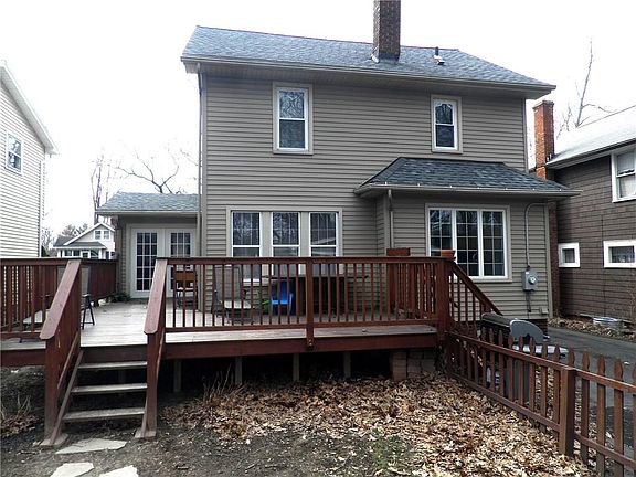 Classic colonial with finished third floor on quiet dead end street. Extra deep fenced yard with mature trees backing to woods and creek. It's a normal backyard AND your own park. Huge master bedroom on second floor was two bedrooms (and could be again). Plus additional bedroom (or play area or office) on fully finished third floor. Updated eat-in kitchen with appliances included. Formal dining room. Living room with bay window plus bonus four season room off living room with French doors to a newer deck. Hardwoods, natural trim, leaded glass. Many new thermopane windows. Partially finished basement with full bath and separate workshop area. No sump pump needed. Extra deep 2 car garage plus shed. Vinyl siding. Full tear off roof in 2013. Updated electric. Brand new high-efficiency furnace!