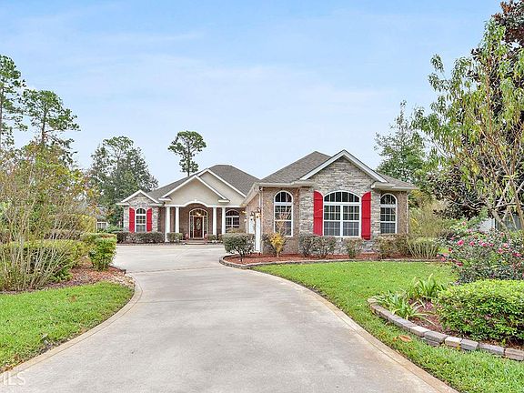 The epitome of gracious living in the beautiful, gated community of Osprey Cove, a private golf, waterfront and social club. This large, over 2900 sq.ft., custom-built brick and stacked-stone home is nestled in a quiet cul-de-sac. The large front porch is perfect for relaxing watching the beautiful coastal Georgia evening sunsets or visiting with neighbors. A true lakefront oasis with screen porches letting in an abundance of natural light into every room. Enjoy an exceptional owner suite with a grand master bathroom. French doors lead to the breath-taking outdoor screened living area with summer kitchen. The grand bathroom receives natural light from above and blankets the vanity area of white solid countertops, neutral tile flooring and beautiful cabinetry. A generous walk in custom closet, oversized double shower with built-in full-length bench and a private water closet add to the luxury of this space. The residence is a split-plan design boasting a private entrance to the bonus suite including a private screened porch overlooking the serene lake and gorgeous eastern morning sunrises. Bountiful fruit-bearing trees are sprinkled throughout the property for a special treat. The phenomenal views of the sparkling lake and seasonal view of the championship golf course are incredible from the open floor plan containing the great room with gas logs and stone fireplace, kitchen, and breakfast area. Just a short distance to Osprey Cove Clubhouse and golf amenities. Bobby Jones Links named Osprey Cove as the Club of the Year 2019. Bamboo flooring, beautiful window blinds, a wine cooler, 3-car garage, walk-up stairs to the attic, separate dining room, stainless kitchen appliances and roll-out shelves in lower cabinets, on-demand hot water, huge walk-in pantry, laundry with beautiful cabinetry and generous countertops and a 5-burner Jenn-Air cooktop.....