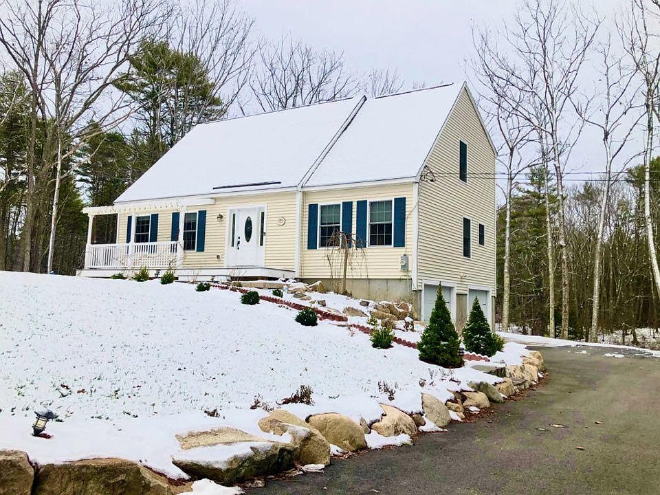 Nestled on a scenic knoll privately tucked away from the street on 3.47 acres of lush landscape that features perennial plantings vegetable gardens and stone out-croppings this charming cape-style home offers significant upgrades and numerous custom features. A private pond offers year-round enjoyment whether watching sunsets from the wharf on warm summer nights or lacing up your skates to go for a twirl in the winter. Constructed in 2017 with a flexible, open design highlighted by bamboo hardwood floors throughout a bright, sunny main level that includes a full master suite, granite gourmet eat-in kitchen and large living room. The upper level features a full shed dormer that affords space for 2 large bedrooms and a full bath. The day-light walkout basement has been fully finished providing additional living space with separate entrance for in-laws, guests and relatives.