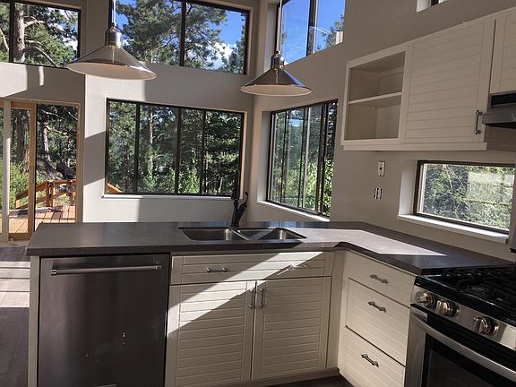This is a light, bright contemporary feeling home with all new paint, flooring and carpet, two completely new bathrooms (still under construction). The home has 4 bedrooms, 3 full baths, spacious open living room and kitchen with views of Mt. Rosalie & Mt Evans. Main level laundry, kitchen eating area and dining area too. All new deluxe master bath has steam shower, heated floors, & granite counter. Rec room on lower level. 2 car detached garage. All on a gorgeous and private 1.5 acre lot with rock outcroppings and mountain views on a quiet cul de sac. Just 4 minutes to miles of trails and open space and just 6 minutes to Evergreen amenities. There are just a few photos right now as bathrooms, etc. still under construction.