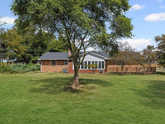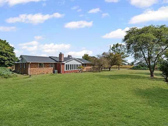 Spacious 1-story ranch on 6.2 acres with endless country views and a 3/4 basement. This well-built, all-electric home offers 3 bedrooms, 2 bathrooms, and a 2-car attached garage with handy overhead storage. The kitchen features abundant cabinetry and a counter bar, opening to a bright dining area and large living room. Enjoy the inviting 3-season sunroom with pretty brick walls and a cozy fireplace, leading to a composite deck perfect for outdoor entertaining. The basement includes a 200-amp heater and two crawlspaces for extra storage. An auxiliary generator and a central vacuum system add convenience and peace of mind. Updates include a new roof and freshly tuckpointed chimney (2020). A 50x90 machine shed with a dirt/rock floor and a separate barn provide space for equipment or animals. The private well (1988) supports country living, while mature trees and open yard space offer room to roam. A solid home with room to personalize, ideal for those seeking quiet acreage, outbuildings, and comfortable single-level living.