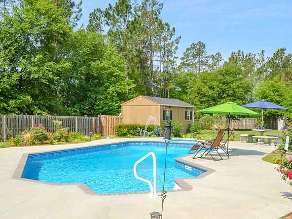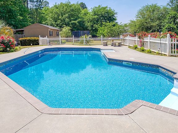 Beautiful Model home with hardwood floors and window treatments throughout. Master bath with custom tile, walk in shower, and soaking tub. Sunroom leading to a 12x20 covered deck looks over a gorgeous in ground saltwater pool surrounded by palm trees and rose bushes on almost 1 acre with a powered 12x24 workshop/pool house and 10x24 covered shed. Great yard for kids that is completely fenced.