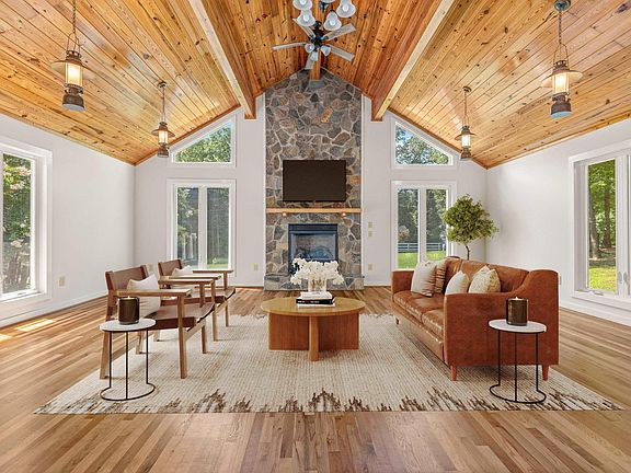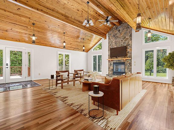 Experience the charm of this freshly painted 3-bedroom, 2.5-bathroom, 3,248-fin sq ft home, nestled on 3.10 partially wooded acres in Gordonsville's Dogwood Lake Estates neighborhood, just minutes from Lake Gordonsville. This private retreat features a newer HVAC (with transferable warranty until 2030) reliable firefly high-speed internet and numerous updates, including a newer hot water heater, washer, dryer, bathroom vanities, and refinished hardwood floors. Enjoy a newly finished half bath, cozy gas fireplace, and brand-new LVP flooring in the basement. The Great Room showcases heart pine cathedral ceilings, custom drop lighting, a stunning floor-to-ceiling stone gas fireplace, and abundant natural light from the oversized windows. The large kitchen boasts a live-edge stone countertop, solid wood cabinets, stainless steel appliances, and two spacious pantries. The first-floor primary suite offers serene wooded views, a walk-in closet, and a luxurious en suite bath. A versatile bonus room on the first floor can serve as a fourth bedroom, home office, or flex space. Come and explore this exceptional home!