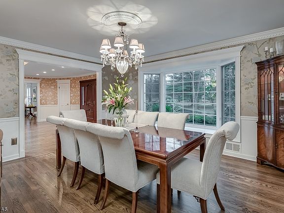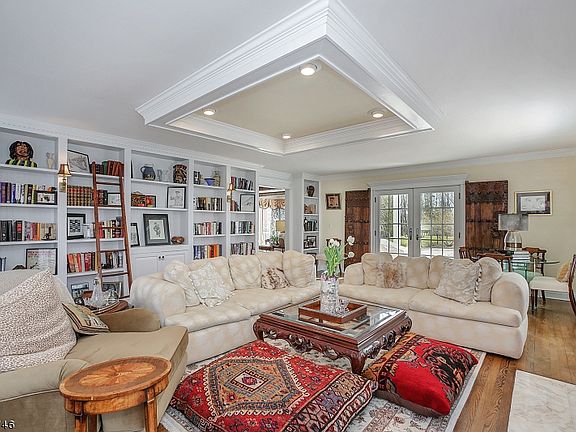 Simply beautiful! Warm & inviting colonial set in Estate area of Basking Ridge. Three lush acres of level, usable land which includes large deck,patio & inground pool surrounded by perennial gardens. This impeccably maintained home has an elegant, yet comfortable, ambiance. A recently renovated kitchen compliments the hardwood flooring, crown molding, & custom built-ins found throughout the home. A beautiful living room & formal dining room greet you from the elegant foyer with curved staircase and walls. Living room features a gas fireplace and a wall of custom built-ins. A large family room includes a wood burning fireplace & wet bar. The second level boasts 4 spacious bedrooms & 3 updated full baths. The master suite has sitting room/office, light-filled bath &sauna. This is a house to call home!