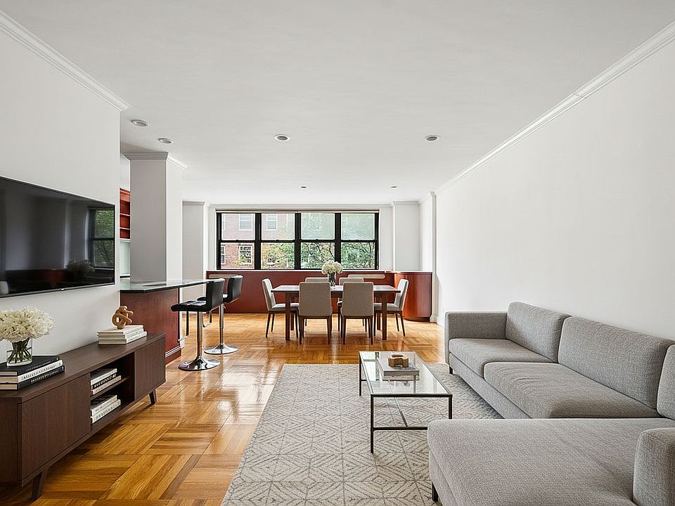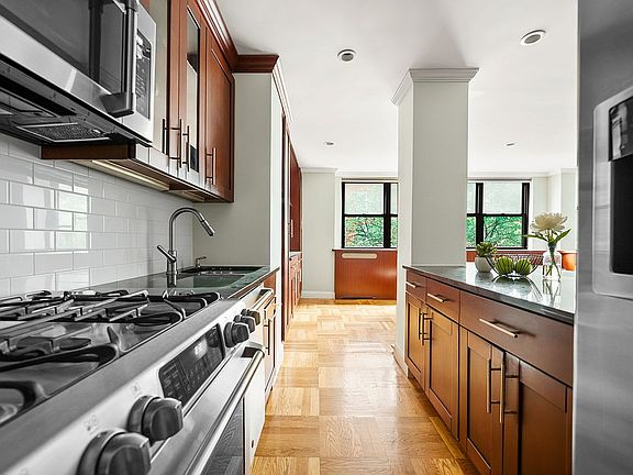 The renovated, windowed kitchen features modern finishes and generous storage, while the primary suite offers a double exposure, excellent natural light, and an en-suite windowed bath. Wood floors run throughout, and nearly every closet has been thoughtfully outfitted to maximize storage. Tree-lined views add warmth and charm to the home.