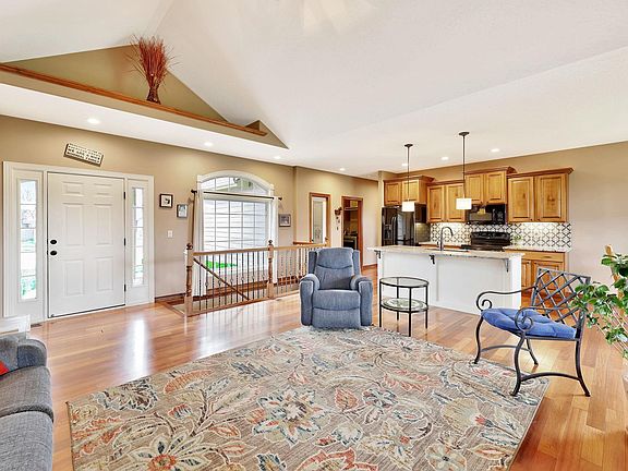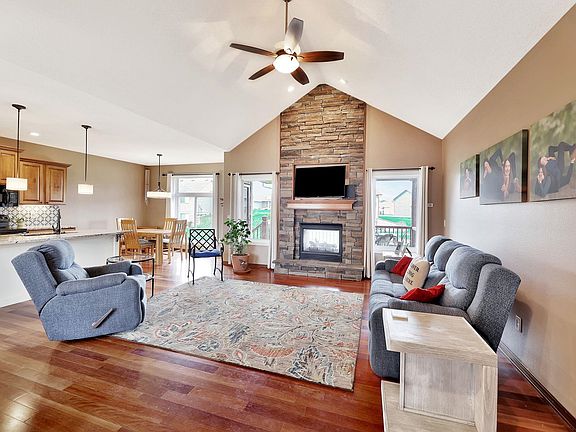 Walk into your new home and into an incredible open floor plan with SIX bedrooms! The large living room features a super high vaulted ceiling, wood floors and a two-sided fireplace with stone to the ceiling! The open kitchen features maple cabinetry, a large island with granite, appliances which will stay with the home and a walk-in pantry! The dining room has large windows to take in the outdoor view. The entertaining space continues onto the covered deck with the second side of the fireplace! The primary bedroom features a tray ceiling with wood trim and lighting, plus oversized windows. The en-suite bath features double sinks with granite, bathtub, a large walk-in tile shower and a huge walk-in closet! There are two more bedrooms and another bath on the main floor of this split bedroom plan. Down the stairs to the lower level is a great rec room with view-out windows and a wet-bar rough in. There are 3 more finished bedrooms in the lower level providing options for sleeping or working or whatever you need! The backyard is fully fenced with wrought iron and continues past the fence and has a view of the lake! New HVAC in 2024.