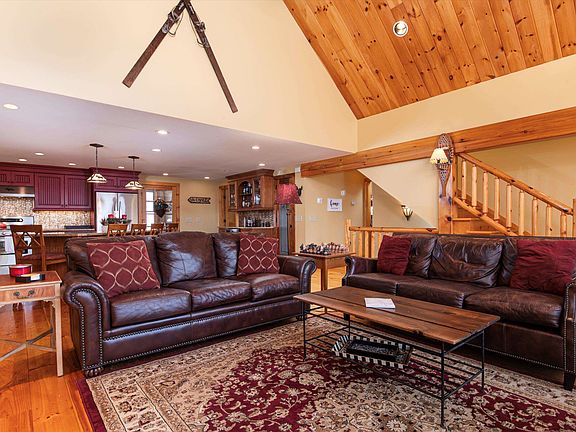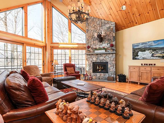 The architectural design of this Hawk Resort home is a blend of rustic charm and contemporary elegance, crafted to complement the peaceful natural surroundings including hiking, snowshoeing and cross country trails. Warm wooden elements, a wall of windows and soaring ceilings flood the space with natural light and frame the Mountain View in this main level open floor plan. The main level offers 2 “bookend” primary en suites leading to the living area adorned with a stone fireplace that serves as the perfect gathering spot for entertaining or just cozying up for a relaxing evening. The kitchen which is a chef's dream with sleek countertops, custom cabinetry, built-in bar and expansive island combining function with style, making it the heart of the home. The spacious dining room with breakfast bar is open to the kitchen and leads to the screened in porch and hot tub. Added elements include entryway to store your skis and boards, large mudroom with custom lockers, walk-in pantry and upper-level bonus room with vaulted ceilings. The lower level with 10 ft ceilings is bright and open with a large den and recreation area, 2 additional bedrooms and a full bath. Hawk Resort was recently purchased with plans to complete a full renovation by the summer of 2026! Close to Okemo, Killington, the lakes region, golfing, villages and restaurants. Visit this beautifully furnished home, it will not disappoint.