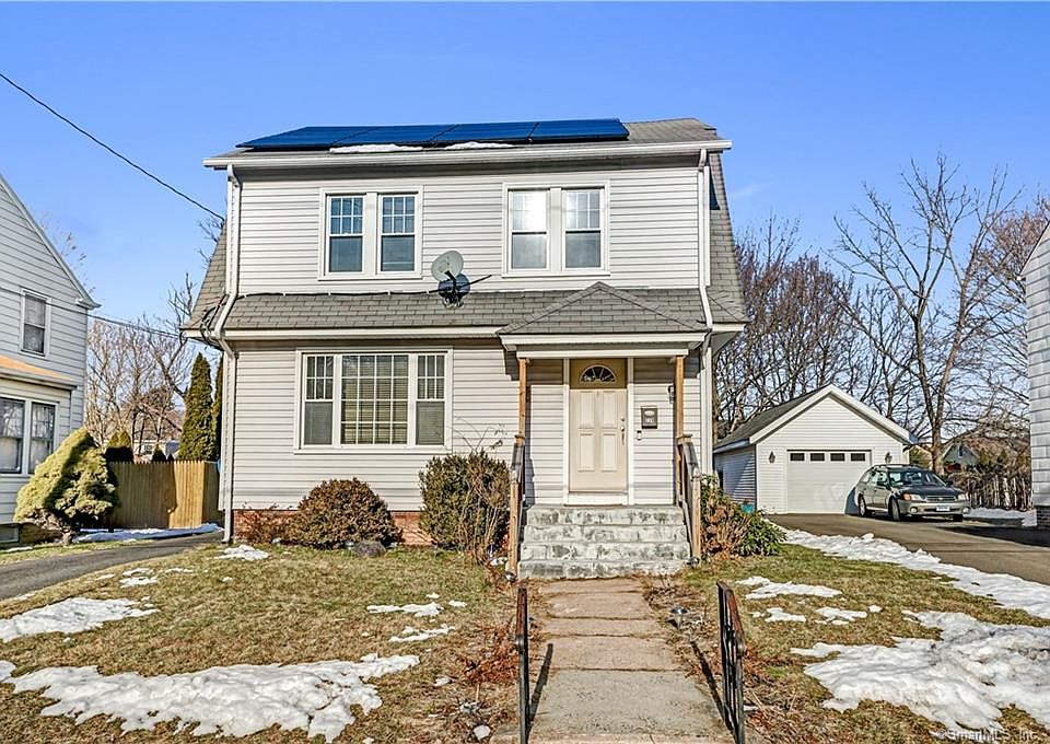 Cute & Cozy MOVE-IN Ready Colonial has 3 bedrooms, 2 Full baths & 1/2 bathroom, UPDATED kitchen WITH SS APPLIANCES (NEW Garbage disposal, living room, pellet stove, dining room, Hardwood FLOORING throughout the home, NEW Water Heater, NEW Oil Tank, level backyard, and oversized garage (NEW Roof offers lots of storage space, plenty of parking, FENCED YARD, FINISHED lower level WITH a BONUS ROOM & FULL BATH for extra recreation space. SAVE on your electricity with Solar panels on the house that are PAID for already/NO LEASE. Close to shopping, restaurants, public transportation, and major highways This won't last....make an appointment today