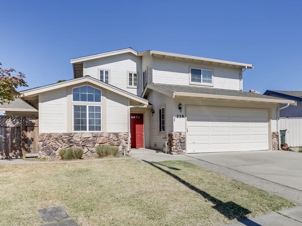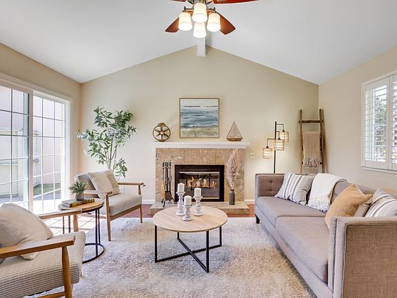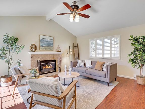 On a sun-speckled street in the Laurelwood area of Salinas, this lovely home welcomes its next owners to delight in its flexible layout and serene mountain views. Privacy, at last! Both upstairs bedrooms, including the spacious primary, enjoy en-suite bathrooms, and a ground floor bedroom has easy access to a third full bathroom. Those who visit smile as they pass easily from room to room, realizing that this home answers every need. The formal dining room, where light streams in through sliding glass doors, sits conveniently between the living room and the kitchen. Each room is distinct, yet the flow feels undeniably natural. Host your friends, and play chef in an inviting, light-filled kitchen with stainless steel appliances, granite countertops, and white cabinetry against a warm tile backsplash. There is plenty of space here to add a dining table, a desk, additional shelving, a TV, or whatever else you can imagine! After a meal, head across to the living room and unwind by the beautiful fireplace. As with most rooms, this one features an elevated sloped ceiling. Or, opt for some fresh air in the fenced yard with a paved patio, a built-in grilling station, and wraparound grassy spaces. Come see for yourself what is clear to everyone: the possibilities here are truly boundless.