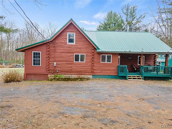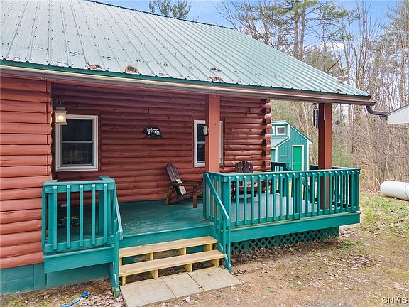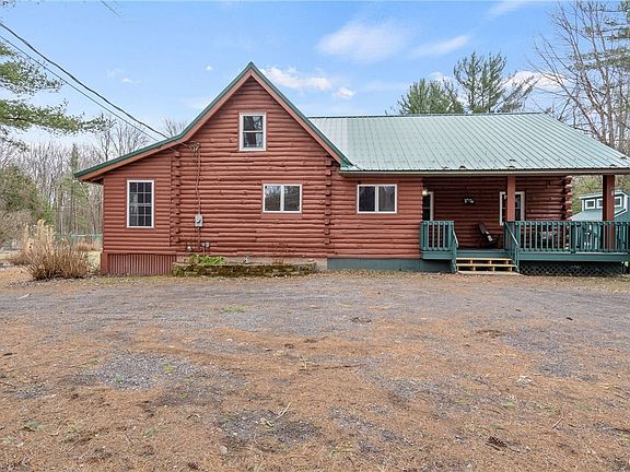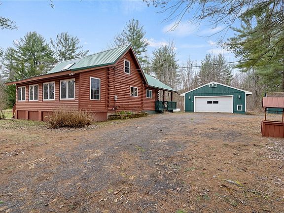 Welcome to this enchanting 3 bed, 2 bath custom log home situated on 5.40 lush acres. Beautifully maintained inside & out with a long list of updates and upgrades, this is truly a "turn key" home. The log construction exudes timeless appeal, while the open layout in the main living area, cathedral ceilings & incredible detail sets this home apart. A big country kitchen with new fingerprintless, stainless steel appliances, wifi connectivity stove, washer and dryer, new & efficient wood stove, kitchen island, insulated skylights, and light fixtures. You'll love the additional 3 out buildings, all with electrical- a detached 2 car garage, a large barn with a bar that is perfect for entertaining. The other side features an additional bay and workshop area, while the full upstairs is great for additional storage. The "she shed" is surrounded by pathways through lush flower gardens, a fenced in vegetable garden nearby and cozy fire pit area, Relax and unwind on the elevated deck overlooking the gardens. The remaining wooded property has maintained walking trails throughout and is perfect for outdoor activities. This home offers the tranquility & serenity you've been longing for!