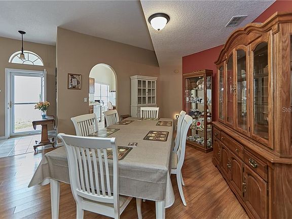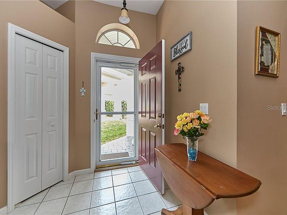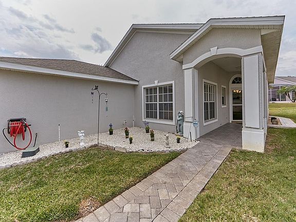 This Ridge Mont model has been extended in sq. ft. to include an 18 x 20 beautiful air conditioned Florida room with oversized tile, window shades & ceiling fans, and has a lovely view of a semi-private back yard. From the oversized brick paver driveway, enter into a spacious living area with wood floors, which extends out to the Florida room; off of this room is a concrete patio for outdoor cooking. Three bedrooms offer lots of extra space for both storage and company, in a split bedroom plan. The master bedroom has wood flooring; two guest rooms have carpeting. Cultured marble countertops add to the beauty in the master bath with lovely white cabinets. The front facing kitchen has dark oak cabinets w/pull out drawers, and nice tile floors. An interior laundry room is spacious & conveniently located near the kitchen. A bonus to the garage includes pull down stairs and a remote control screen. Some furnishings are available outside of contract. Be sure to view this one on a quiet, beautiful street! The High Vista Clubhouse in this 55+ golf course community has a ballroom, library, card room, fitness center, arts & crafts room & planned activities. There is a unique pub & game room. Outside is a huge heated pool & hot tub along with sunny & shaded seating areas. Outdoor activities include shuffleboard, tennis, bocce ball & pickleball courts along with miles of walking paths. Nearby is shopping, restaurants, theatres, hospitals, airports & area attractions.