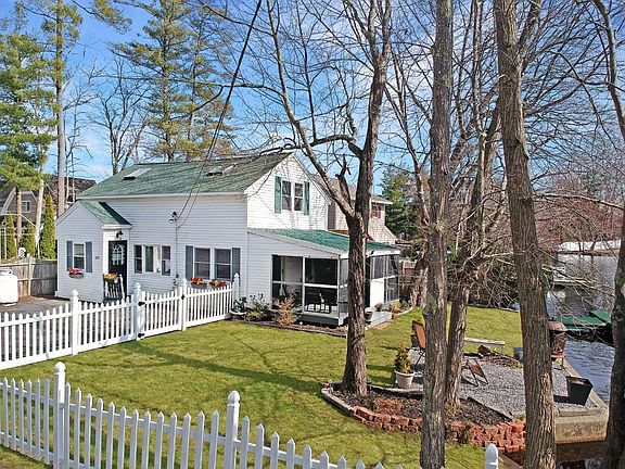 Don't miss this opportunity to enjoy waterfront living on the shores of Arlington Mills Reservoir in Salem, NH. This year round home offers summer fun in the way of fishing, boating and swimming. Your fun continues in the winter months with ice fishing, ice skating and four wheeling. There is an open floor plan with kitchen/dining area which opens to a fully screened in porch overlooking the water, docks and beach. Two bedrooms feature vaulted ceilings, skylights and fans. Hardwood as well as vinyl plank flooring throughout the home. The heating system, bathroom and roof recently updated.