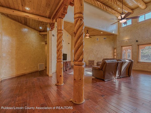 A grand mountain home built for connection, comfort, and quiet enjoyment. From the moment you step inside, you're greeted by exquisite craftsmanship--soaring arch-top ceilings and dramatic custom spiraling vigas anchor the great room with bold elegance and warmth. The layout flows effortlessly into an oversized dining space and open kitchen, perfect for hosting family and friends year-round.Designed to accommodate large households or multi-generational living, the home includes an attached suite with its own private courtyard--ideal for a game room, guest quarters, or even a creative studio space. The surrounding property offers exceptional privacy, with a serene backyard and wooded acreage accessible via stone stairs. A level area set deeper into the lot presents the perfect location