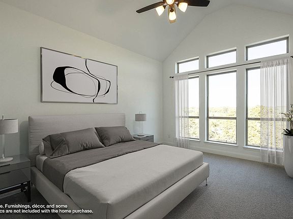 Step off the front porch into the extended entryway with a 12-foot rotunda ceiling. Off of the main hallway are two secondary bedrooms which offer full bathrooms and walk-in closets. Adjacent is a private guest suite featuring a full bathroom, walk-in closet and linen closet. As you enter into the vast family room you are greeted by a fireplace and wall of windows. French doors open into the game room which is located off of the dining area. The kitchen hosts an island with built-in seating, ample counterspace, and a walk-in pantry. The primary bedroom offers three large windows. The primary bathroom hosts dual vanities, a garden tub, large glass enclosed shower, and two walk-in closets. Covered backyard patio. The mud room and utility closet are off of the three-car garage. Representative Images. Features and specifications may vary by community.