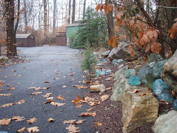 Custom built passive solar home in Bucks County is nestled in a private park-like setting and minutes away from shopping centers. This home features solid stone and "I" beam construction, custom solar shades cover each Andersen thermal pain window. High efficiency central air system, four zone heating system with summer/winter hookup for hot water and public sewer. Floor to ceiling brick and stone fireplaces, wet bar with custom wraparound woodwork, full-size 3 baths, 2+ car garage, wraparound multi-level deck offers over 1600 square foot for entertainment space. Huge eat-in kitchen with a double oven, Island with hood and lots of counter space. Huge parking space all leveled and blacktopped can accommodate 15 cars. Large free standing workshop/shed with 120 & 240 electric service. Separate electrical backup box was installed with power hookup for the generator of your choice. Because of a full-size bath on first floor an in-law conversion is not out of the question. This home offers maximum family comfort and energy efficiency in a private location with unique private driveway. A little slice of paradise!