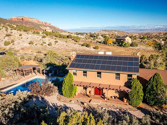 Experience unparalleled, sweeping 360-degree views from this exceptional 2.40-acre property, ideally situated at the base of The Colorado National Monument and in close proximity to the renowned Tabeguache Trail. This residence offers a seamless blend of comfort, expansive space, and natural beauty, perfect for both sophisticated entertaining and serene relaxation, embodying the best of Western Colorado living. The exterior is designed for a luxurious lifestyle, featuring exceptional amenities including a heated in-ground saltwater pool, a retractable pergola, and a tranquil hot tub. Inside, the home boasts two wood-burning fireplaces and a primary suite designed for comfort, complete with dual spacious closets and a luxurious five-piece primary bathroom. The finished basement provides generous space for recreation, featuring an oversized TV room perfect for movie or game nights, and a separate game room with a wet bar option. This property masterfully combines space, functionality, and breathtaking natural vistas. Seller will include all pool furniture. "The seller is pleased to offer the dining room table and all chairs to convey with the property at closing." Additional Feature: The solar system is owned outright, with no lease or loan to assume. Seller-paid rate buydown available!