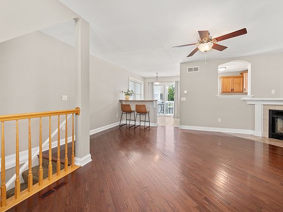 You will be surprised and delighted with this "END UNIT" beautiful townhome! The entry porch welcomes you into the foyer displaying attractive tiled flooring, side light, and a 2-panel coat closet. The Living Room boasts hardwood flooring and a corner gas log-lit fireplace with tile and white molding surround. An arched opening looks through to the kitchen area. You will love the open breakfast bar in the dining area offering table space too. This area leads out onto the upper-level deck... enjoy the outdoor sunshine and fresh breeze. The kitchen showcases Schrock tiered cabinetry with crown molding and dovetail drawers. New black hardware updates the cabinets to today's appeal. A double stainless-steel sink and high faucet, clean white appliances, and window blinds complete this charming eat-in kitchen space. 2-panel white doors, white trim, white window blinds, elegant light fixtures, and neutral interior color schemes create a "feel-good" home. The main level full bath hosts a pedestal sink, tile flooring, a white wall cabinet, and a pretty oval mirror. An oak-spindled open cathedral staircase, wall sconce, and window lead to the upper-level bedrooms. The primary bedroom suite features an oval soaker tub with a shower and a vanity with a makeup seating arrangement. There is an 8'x6' walk-in closet. Both bedrooms come equipped with ceiling-light fans and share the laundry room which includes a washer and dryer. Wait, there is more! The lower-level look-out basement presents the 3rd bedroom, also with a ceiling-light fan. There is a shoe cubby at the bottom of the stairs. The garage accommodates a closet, rough-in water supply, and workbench. A 48-gallon water heater, energy-efficient furnace (new in 2022!), central air system (new in 2022!), and water softener complete this lovely townhome. This is an amazing opportunity to LOVE your new HOME and where you LIVE!