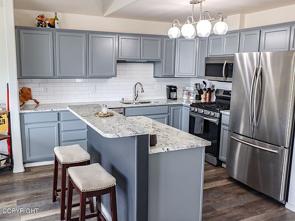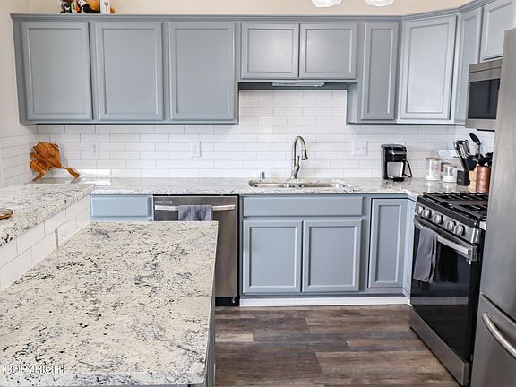 Searching for mountain views? Look no further! Well cared for townhouse off Turpin, near JBER and Tikahtnu. Recently updated w/granite counter tops and new SS appliances. Master bed and master bath upstairs. Two add'l beds/bath down. Large entry way. Deck off back facing mountains AND a deck off MB too. New HWH in 2020. Fenced yard and one of the largest lots in the culdesac!