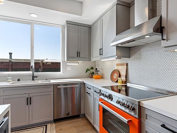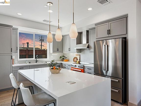 Stunning modern design! This solar powered eco-friendly Icehouse townhome has it all! Gourmet kitchen featuring Bertazzoni appliances, Brizo touch faucet, quartz countertops, waterfall island and Anthropologie curtains. Great layout with 3 bedrooms and 2 bathrooms all located on the same floor. Primary suite includes stunning Hygge & West wallpaper, West Elm light fixtures and curtains, dual sinks and walk-in closet. White oak hardwood floors throughout. Watch the sunset and fireworks from your windows, enjoy the natural light flooding every room, stay comfortable with Nest dual-zone climate control, work out in the garage (TRX hookups await you!), CAT6 ethernet for fast Wi-Fi, plumbed for electric car charger, keyless entry. This house is both stylish and energy efficient! Pet friendly! Close to Oakland's vibrant Uptown shops and restaurants with convenient access to 19th Street and West Oakland BART stations.