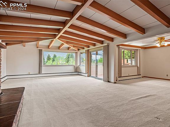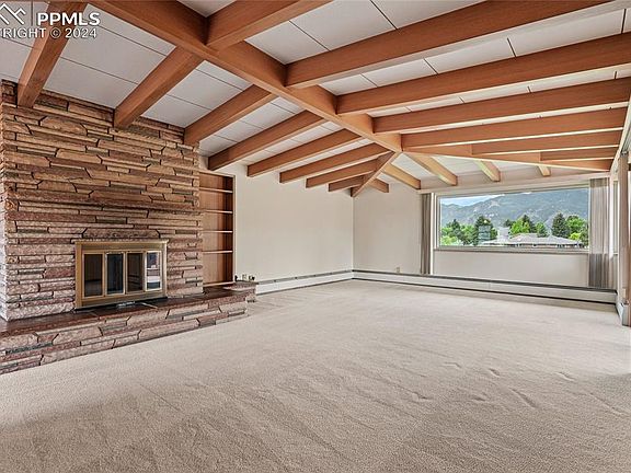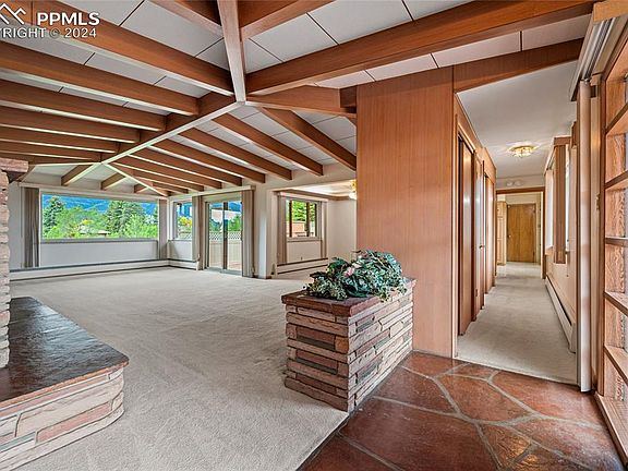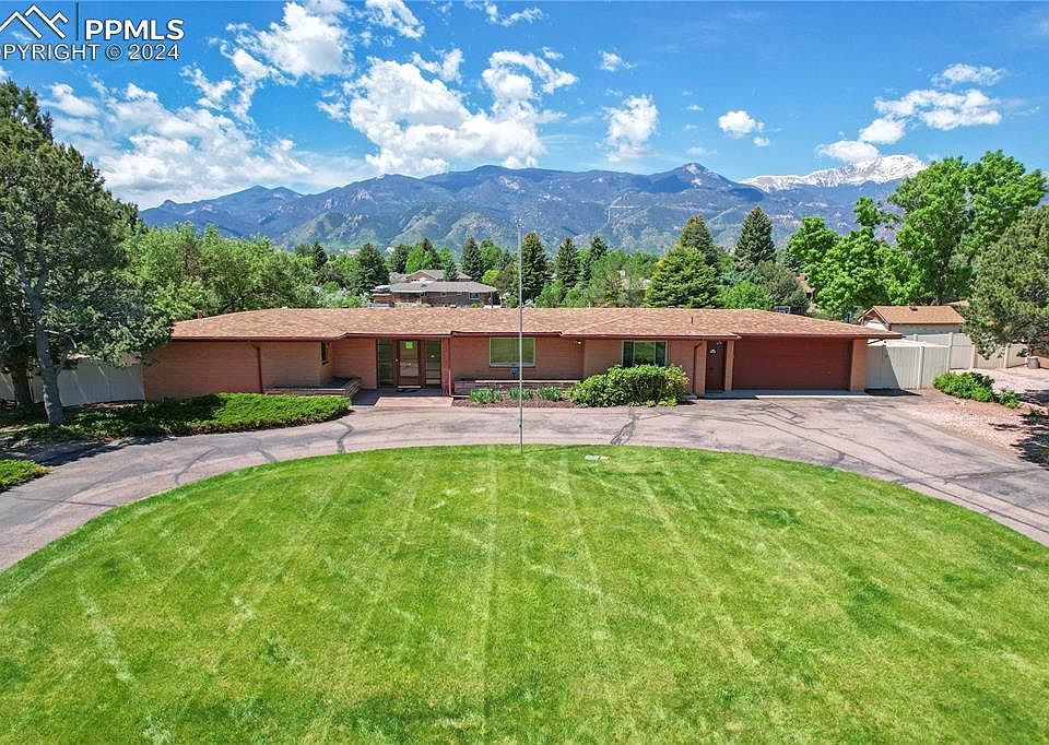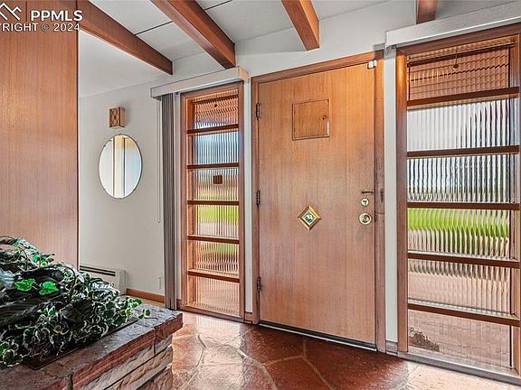 Welcome to your mid-century modern oasis situated against the breathtaking backdrop of Pikes Peak and the Front Range. This well-maintained gem offers the perfect blend of sophistication and tranquility. Step inside to discover a light-filled living room featuring a vaulted ceiling with beams, views, and stone fireplace. The open floor plan connects the living and dining area creating an inviting atmosphere for both everyday living and entertaining. Prepare to be captivated by the warmth of not one, but two cozy fireplaces, perfect for chilly Colorado evenings. The kitchen features the original cooktop, built-in cabinet fridge (not currently functional), wall oven, Pikes Peak views, breakfast area, and a pass through window to the patio. The master suite is a serene sanctuary boasting views of the surrounding landscape and the mountains. A hidden pocket door separates the master bedroom and bathroom from the rest of the main floor creating a private retreat. You'll also find an additional bedroom and bathroom on the main floor of the home. Downstairs, the finished basement provides additional living space, ideal for a home office, media room, or gym. An additional bedroom and a full bath complete this level, offering flexibility and convenience for guests or family members. Outside, the magic continues as you step into nearly an acre of lush, landscaped grounds. Enjoy al fresco dining on the expansive tiled patio with built in outdoor fireplace, or simply unwind and soak in the beauty of your surroundings. With stunning views of Pikes Peak and the Front Range as your backdrop, every day feels like vacation. For those who love the great outdoors, this home is perfectly situated to explore all that Colorado Springs has to offer. Whether you're hitting the nearby hiking trails in Garden of the Gods or simply taking in the natural beauty of the area, adventure awaits just beyond your doorstep. This masterpiece is truly a rare find in a highly sought after neighborhood.