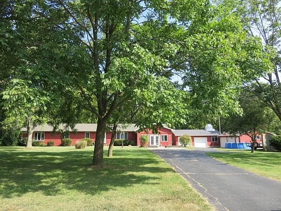 Spacious ranch sits on five beautiful acres of manicured lawn and timber. This five bedroom (includes two master bedrooms), three bathroom 2,680 SF home features an enclosed sun porch, huge open kitchen and family room, large rec room, hardwood and laminate floors, crown molding, built-in bookcases in the living room, updated flooring, updated kitchen and updated laundry room. Outside are a fenced garden; two garages, one 24x36 and one 22x26; chicken coop; loads of walnut trees; and updated vinyl deck. Bonus feature: observatory built into the larger garage!! Enclosed sun porch is not heated or cooled and square footage is not included the total finished square feet of the house.