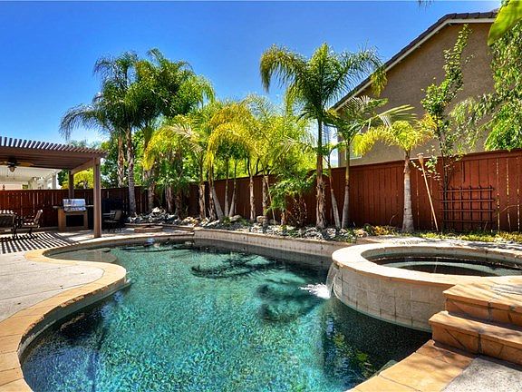 This fantastic pool home is located in the gated community of Legacy at Bryant Ranch in Yorba Linda and has an open and spacious floor plan with 5 bedrooms + a Large Loft / Bonus room and 2 ? bathrooms. Features include a main floor bedroom, granite counter top in the kitchen, wood floors, beautiful wainscoting throughout the home, plantation shutters, crown molding, over-sized base boards, ceiling fans, recessed lighting, an indoor laundry room and a home security system, just to name a few. The master bathroom is upgraded with granite counters, dual vanity sinks, a huge walk-in closet and a separate tub and shower. In the backyard enjoy the gorgeous pebble tech. salt water pool and Jacuzzi that has a great water fountain feature along with a built-in fireplace and BBQ area, perfect for entertaining friends and family. The pool and Jacuzzi also have child safety gates that are easy to install. There is a 3 car garage with tons of over-head storage to keep everything tidy and a small pocket park right across the street. Easy access to the 91 freeway and 241 Toll Road plus there is great shopping, restaurants and entertainment just an exit away at Savi Ranch.
