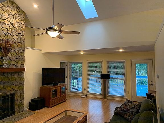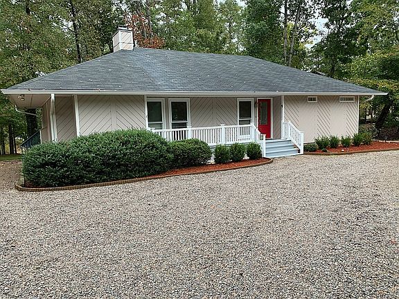 Nestled on a 3/4 acre lot in a small, quiet subdivision -just an hour’s drive from Raleigh and Durham- sets this wonderful waterfront home on Kerr Lake. The 1,546 square foot, 3 bedroom, 2.5 bath home, is perfect for weekend getaways or full-time living. The kitchen and main living area feature vaulted ceilings with skylights, bamboo hardwoods, new granite countertops, and gas logs surrounded by a gorgeous stone fireplace. Split floor plan features master suite on one end of the house and bedrooms 2 and 3 with Jack & Jill bath on the other. Relax on the large deck overlooking the cove, or get a closer look at the lake action from your private dock. The 24’ X 12’ dock has a galvanized steel frame with wood decking. And, the surrounding water is good depth, keeping your boat floating even in the worst droughts. If you like to tinker, check out the oversize 36’X 22’ garage/workshop with insulated and finished walls, along with heat, air, cabinets, and utility sink. And the large room over the garage with kitchenette/bar and full bath makes a great space for overnight guests. Home is ready to enjoy, with fresh paint in most rooms. Windows and exterior doors replaced in 2016.
