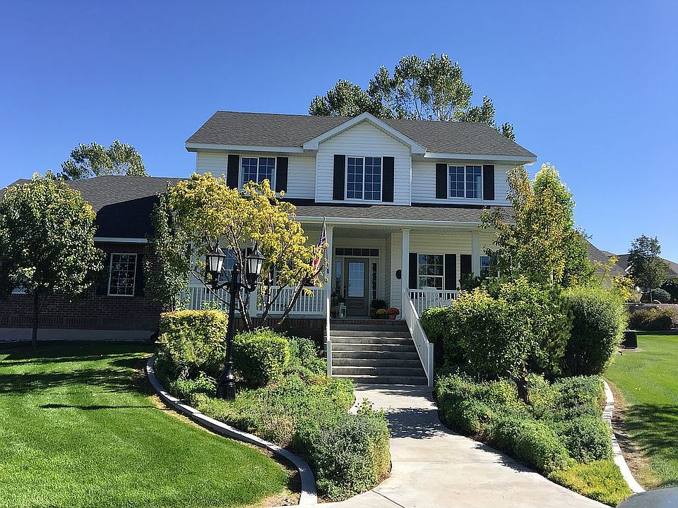 Located in a stunning neighborhood zoned for the new Thunder Ridge High School. This meticulously clean home has 6 bedrooms, all with large walk-in closets. 3.5 spacious bathrooms, two of which the vanity/toilet are separated from the shower (Cultured marble shower and tub surrounds). Not to mention, there are 4 gas fireplaces throughout! This home has 6,000 sq. ft of living space with an additional 1344 square foot gym area with a heated floor and basketball standard. You will find drinking fountains in the basement and main level. The open floor plan includes a large kitchen on the main level with almost all new stainless steel appliances, double oven, bar, and island/prep sink. The main family room has vaulted ceilings and a fun reading loft! As for built-ins, this modern farmhouse includes a China cabinet, Computer Desk with side bookcases, and a Shoe Storage Cabinet in the entry. The finished basement contains a kitchenette and access to the gym. The floors are Hardwood, Tile, and Carpet. Excellent heating and air conditioning. The rear french doors open to a large deck with a Pergola. This home comes equipped with an oversized 3 car garage and 16' x 32' shop with attached 16' x 16' covered patio. The house sits on 1 acre of gorgeous landscape. There are approximately 50 mature trees including: 5 apple, 1 pear, and 1 peach, as well as a Garden area with raspberries and an arbor. This home sits on a corner lot facing northwest including a circular driveway.
