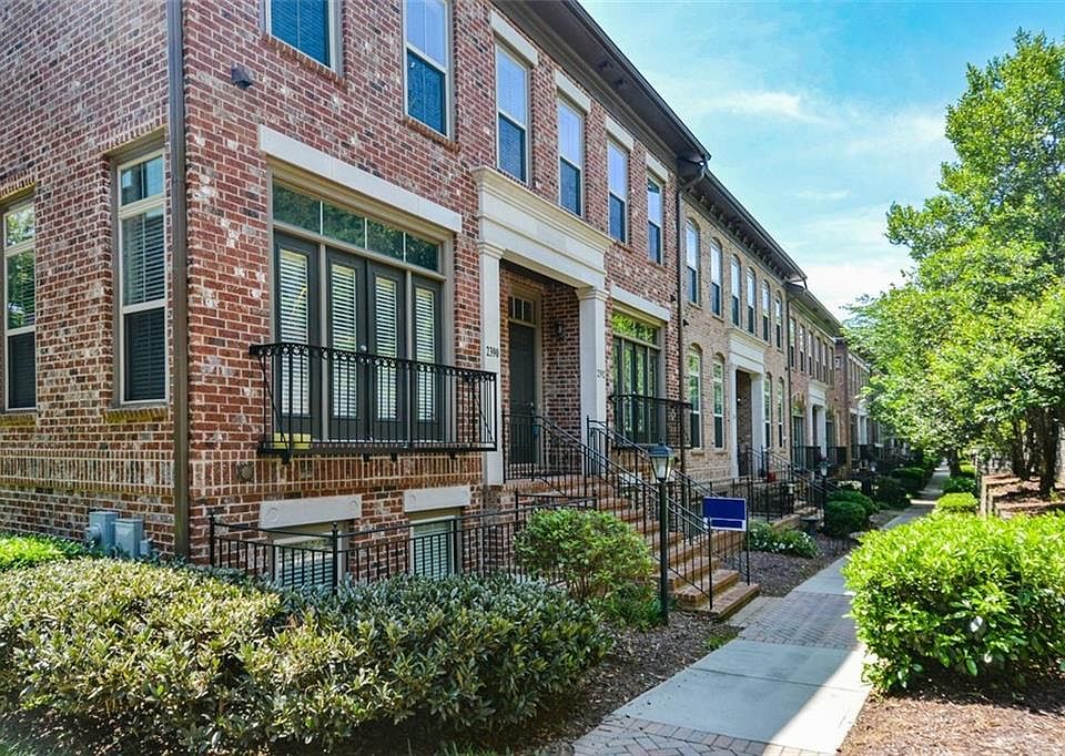 Walk to the Braves Games and the Battery at Truist Park. This three-story brownstone townhome is in a gated community, three bedrooms, 3 ½ bathrooms with hardwoods on the main, recessed lights and crown molding. An open floor plan features a kitchen with a large free-standing island, gas stove, double ovens, an abundance of cabinet space, stainless appliances, including a refrigerator and a view to the family room with a fireplace and built-in bookcases. The family room connects to a deck that overlooks the pool and the building containing the mailboxes. A formal dining room or living room opens to a Juliet Balcony with a tree lined view perfect for your privacy. The primary suite has a trey ceiling, crown molding and bathroom with soaking tub, large shower with glass doors, double vanities and walk-in closet. Laundry room upstairs. Zoned HVAC with newer systems. The two-car garage has room for storage and a storage closet. The HOA covers the roof, exterior maintenance, trash pickup, lawn upkeep, security gate, pool and includes a termite bond. Also, an easy commute and access to I-285, I-75 and downtown Atlanta.
