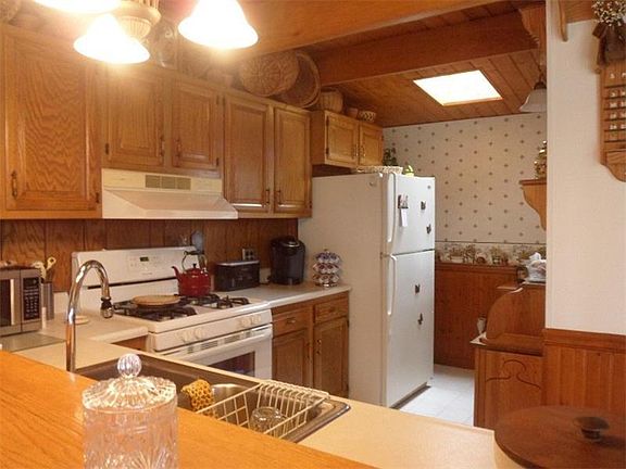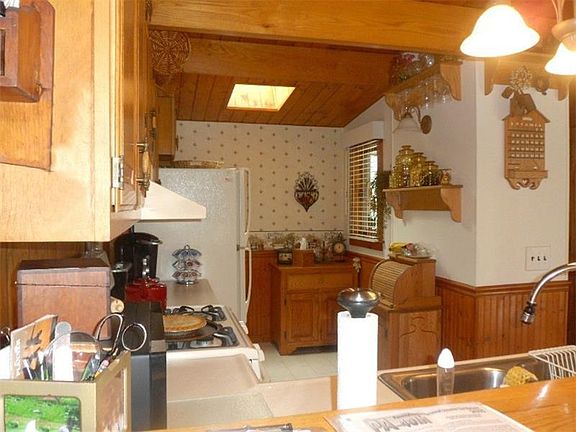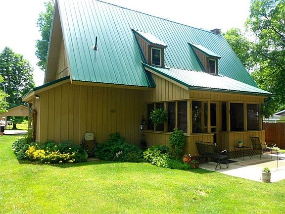 Beautiful home a few minute walk to Pymatuning Lake. Home has beautiful oak rafters and pine tongue and groove ceilings on main living area and 2nd floor. A private back yard, patio, and enclosed 3 season room. Nicely landscaped with perennials to make this a relaxing couples getaway. There is a loft area that could possibly be a 2nd BR or master bedroom could be divided to make 2-- 14x15 bedrooms. Baskets above kitchen cabinets will stay and birdhouses in 3 season room also, if Buyers wants. There is a pantry closet at back of kitchen for additional storage. Appliances newer.Oak stairs under carpet to 2nd floor. All wooden blinds are custom and stay in home.Carport. Ramp boat launch and boat dock available in lottery