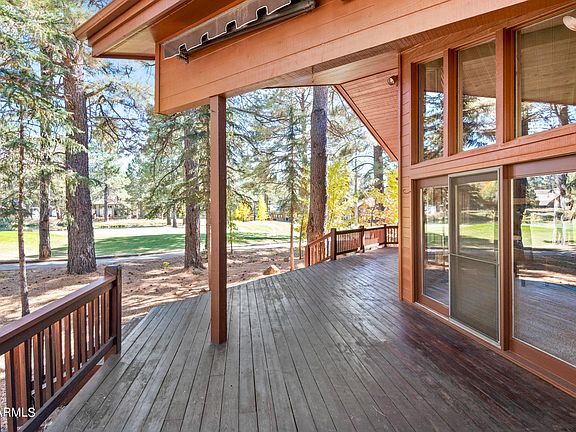 Welcome to your peaceful mountain retreat in Forest Highlands! This inviting home has a cabin-like feel, and is located back on the lot, making it feel even more private and quiet. Exposed wood throughout, coupled with plenty of natural light and vaulted ceilings, creates a relaxed, comfortable atmosphere. The eat-in kitchen has a breakfast nook, built-in desk and laundry room just adjacent, keeping the activity on one side of the home. The inviting living area is adorned with a floor-to-ceiling fireplace and expansive, world-class views of the golf course and pond. Just beyond the living room step onto the covered and uncovered patio area, a perfect spot to take in the fresh mountain air under the towering ponderosa pines. On the other side of the living room are three generously-sized beds and baths, each with great closet space. The primary en suite is well-appointed with a fireplace, walk-in shower, a platform soaking tub, and separate toilet and bidet. Recent exterior painting, single-level living throughout, and a flat driveway all make for ease of care and use, even in the winter months. Come enjoy the four seasons of Northern Arizona and all the amenities this fabulous community offers!