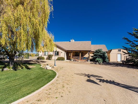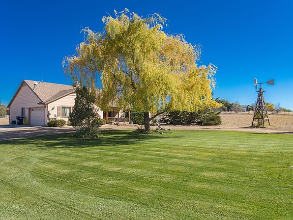 Come through the gated entry and around the circular drive. A charming home welcomes you with a beautiful landscaped lawn, mature trees swaying in the breeze,and a stunning windmill. Sitting on 2 level acres with views of Granite Mountain, this home offers 3 bedrooms and 2 baths, including a master suite with soaking tub and walk in shower. The spacious kitchen has plenty of peninsula seating, eat in dining, and opens up to the living room making an easy flow for all your family and friends. The wood burning rock fireplace and vaulted ceilings are the focal point. This home has wood floors throughout. Front and back covered patios are perfect for enjoying the four seasons of Northern Arizona. This property is a must see, and all animals welcome!