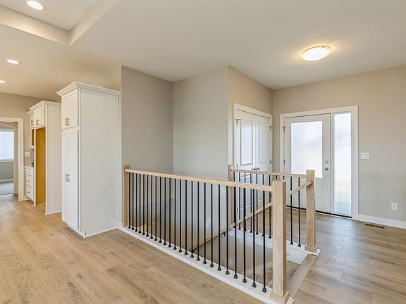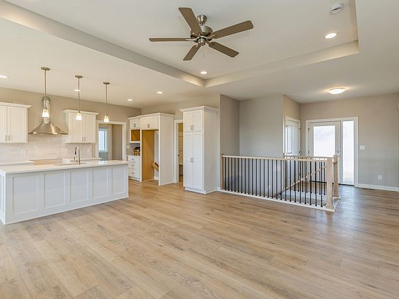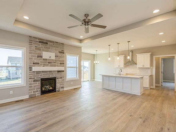 The Vienna plan by Orton Homes is a spacious walkout ranch that offers over 2,890 square feet of total finished living space, with 5 bedrooms and 3 bathrooms. Upon entering the home, you'll find a large coat closet and a dedicated entryway leading into the open living area. The great room features 9-foot ceilings, a full stone fireplace, and a tray ceiling that makes a stunning statement. Solid surface flooring seamlessly connects the living area to the kitchen and dining space. A private hallway behind the kitchen leads to two bedrooms and a full bathroom. Off the garage entry, you'll find a convenient walk-in pantry, lockers, and an additional coat closet. On the opposite side of the home is the luxurious primary suite, complete with a tray ceiling, double vanities, a tile shower, a water closet, and a spacious walk-in closet. This primary closet conveniently connects to the dedicated laundry room, making daily chores easier to manage. The finished basement adds even more living space, featuring a large living area, wet bar, a full bathroom, and two additional bedrooms. Despite all this finished space, there is still plenty of storage available in the utility room. The home also includes a covered deck, cement board siding, and irrigation, offering both style and functionality.