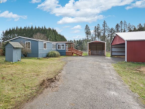 Completely updated nearly 1800 sq ft manufactured home on 5 acres. 3 bds plus office, utility room, 2 full baths. All new paint, carpet. Updated roof, furnace, new well. Primary bedroom w/ walk-in closet, large soaking tub.Large covered RV parking plus 2 car oversized carport plus huge barn with animal stalls!Barn is wired plus 3 separate storage rooms. Incredible price for acreage property. Live in beautiful manufactured home/build your dream home!Close to Estacada,Molalla,&downtown Beavercreek