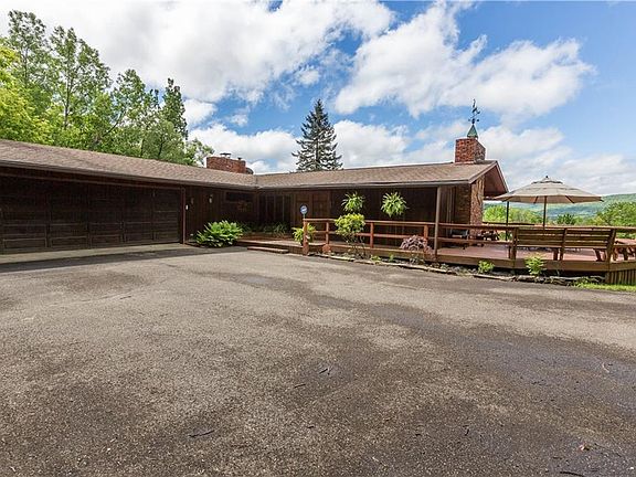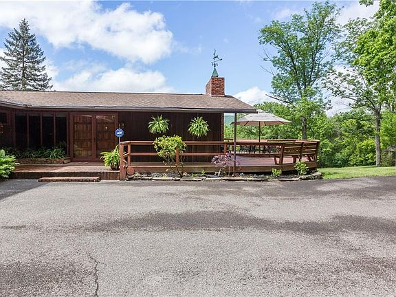 This gorgeous property has breathtaking views of the private pond and surrounding hills! Almost 33 secluded acres include both open and wooded areas. Relax on the wrap around deck or in the screened gazebo. Enjoy the views from the living, dining or family rooms & stay cozy with your wood-burning fireplace and 2 wood stoves for those chillier days and nights. Large eat-in kitchen and study also on main floor. Finished lower level has 4 large bedrooms, each with their own sliding glass door to outside. Master suite has private full bathroom, office and more closets than you can fill! Lower level laundry room. 2.5 car attached garage has a workshop and storage cabinets. 2 storage sheds, 1 attached to garage. Pond is stocked with bass and koi.