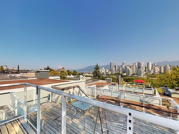 Spectacular water, city, & mountain views from this impeccably maintained 1399 sqft corner townhome featuring 3 bedrooms & 2 full baths. Bright & spacious, this home offers a private 350sqft rooftop deck w/ sweeping 360 degree views, ideal for entertaining. The ground level has its own private entrance, a large bedroom, & a full bath. The chef’s kitchen is equipped w/ granite countertops, stainless steel appliances & breakfast bar, overlooking the open-concept living & dining areas w/ a cozy fireplace & new carpet. Upstairs w/ a generous primary bedroom w/ a walk-through closet, plus a 2nd bedroom. Includes 1 storage rm & 1 secure parking stall w/ direct access to the unit. Located in the heart of Fairview, an unbeatable, highly sought-after location! 2025 BC Assessment $1,338,600